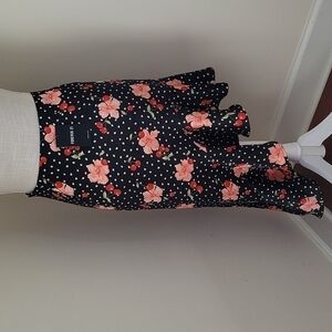 Satin Floral/cherry print ruffle skirt with High/low hem,, concealed Zipper on the side.
