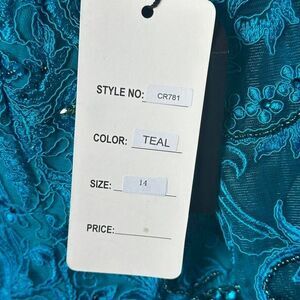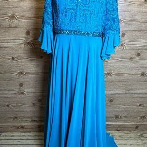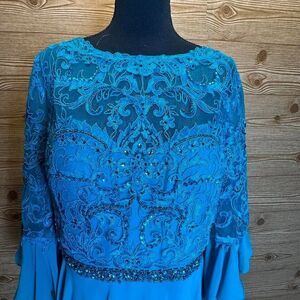 Elegant blue prom dress featuring intricate lace detailing on the bodice. The gown has long sleeves and a flowing skirt, perfect for formal occasions.