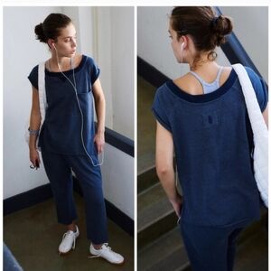 So cool and casual, this effortlessly essential set is featured in a slouchy, relaxed fit and sweatshirt-inspired fabrication with short sleeve top and coordinating high-rise, cropped pants for the ideal finishing touch. **Fit:** Relaxed, slouchy fit **Features:** Top: Scoop neckline; front bust pocket; raw seaming; side slits at bottom Pants: High-rise style; elasticated waist; side pockets; cropped silhouette; dropped crotch for shape; raw bottom hem for a lived-in look **Why We ❤ It:** The perfect pick to take you to and from your fitness-focused activities, this totally timeless set is the ideal done-in-one look for absolutely any occasion.