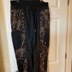 Free People Movement "Mystic Moon" joggers with brown and ivory embroidery. Measurements are: