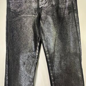 Ultra high rise. 5-pocket style. Belt loops. Zip fly with button closure. Metallic silver coated black denim.