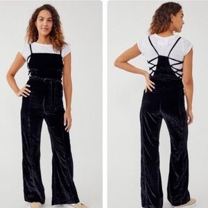 NWT Free People Forever 90’s overalls. Gathering inspiration from the past and interpreting it for the present in a unique way is at the heart of the Free People aesthetic. These overalls are a great example of just that. Your favorite retro silhouette with a contemporary twist. Featuring a square neck line, lace up detailing and zipper at the sides, soft crushed velvety fabric, side pockets and a slim fitting bodice with a kick flare leg. Forever flattering for every occasion, these overalls are sure to stun from season to season.