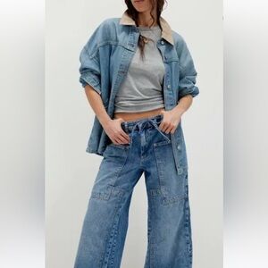 NWT FREE PEOPLE Bayou Blue Curvy Outlaw Wide Leg Distressed Jean SZ: L