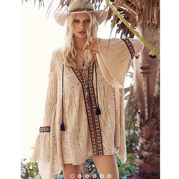 Gauzy crochet tribal inspired open shoulder tunic featuring embroidery detailing. Low V-Neck with drawstring ties and tassel ends. Effortless, oversized fit with bell sleeves and an uneven hem.