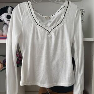 Features: Soft, light ribbed pointelle fabrication, V-neckline, fitted long sleeves, lace trim at neckline, slotted ribbon detailing. New with tags. Size small