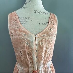 FREE PEOPLE Riptide Sleeveless Open Front Dress Cutwork Lace Peach Size XS It's a dress, it's a top it's super cute no mater how you wear it! Soft-touch jersey V-neckline Button placket Tassel detail tie-waist Hilo maxi design Relaxed fit Hand wash 100% Viscose Hand Wash Cold