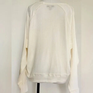 NWT Free People Alabaster shirt in size small. This shirt is v necked with dolman style sleeves. The bottom has a waist band, but not fitted. The sleeves are full length. The fabric is mostly waffle weaved with some ribbed fabric throughout. Raw hems are at seams. This can be worn with one shoulder off. Nice light shirt for a cool evening.