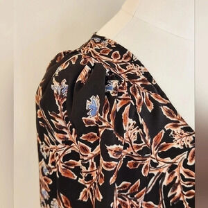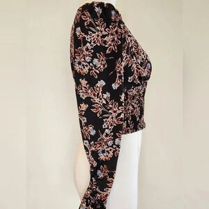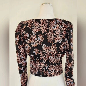 NWT Free People Santiago smocked, crop blouse in size small. This little scoop necked blouse has a black background with rust leaves and light blue flowers. The bottom 8" of blouse is smocked around waistline, which can stretch to different waist sizes. The long sleeves have puffed shoulders, and ruching at wrists. Also at wrists are 6 covered buttons.