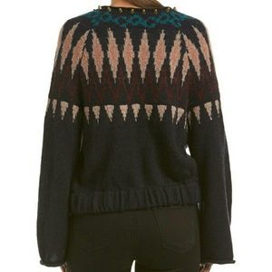 This stunning Free People zip-up cardigan is a piece of art! Stud and Fringe detailing. Elasticized band at hem. Zipper closure. Beautiful fun pattern around neckline with brass studs accent. Bell sleeves. Has a loose fit. Approximate 22" from shoulder to hem. Shel:30% nylon, 30% acrylic, 20% wool, 20% Mohair. Embroidery: 39% acrylic, 28% polyester, 16% wool,9% rayon, 5% mohair, 2% nylon, 1% alpaca. Hand wash cold. Black combo