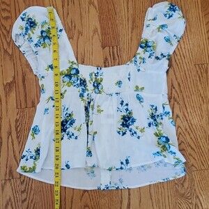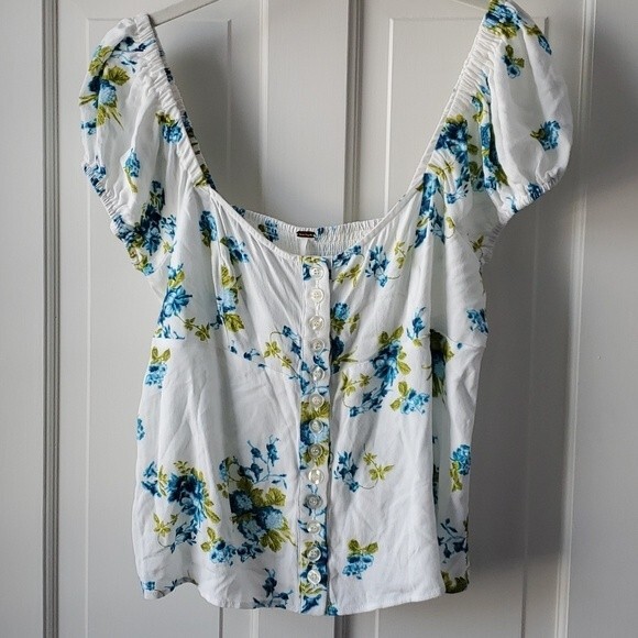 NWT FREE PEOPLE WHITE BLUE FLORAL CROPPED OFF SHOULDER PEASANT TOP SIZE SMALL