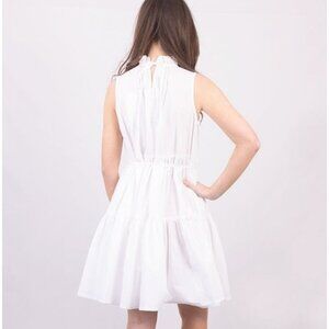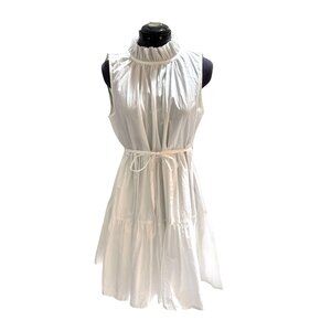 This organic cotton tiered dress features a breathable poplin fabric with a ruffled high neckline, creating an elegant and comfortable fit. Designed with a tied waist and neck closure for added style, it is a versatile piece ideal for casual summer days, outdoor events, and festivals. New with tags; tagged as a sample dress; never worn.