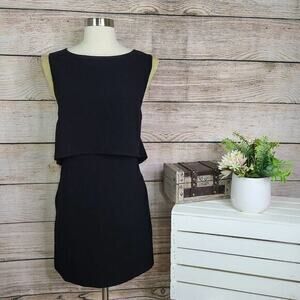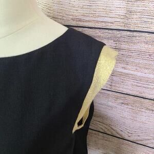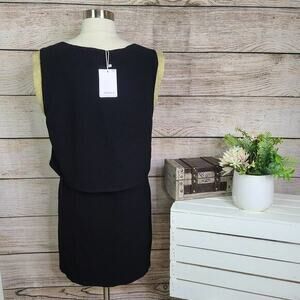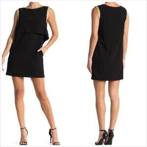 New With Tags! FRNCH Two-Tone Layered Popover Dress. Gold shimmery accents on sleeves. Black dress. A flowy popover adds movement to this woven tank dress, finished off with side pockets and a chic contrast trim. Sleeveless. Crew Neck. Side Slash Pockets. Size Large. Brand New Condition. 97.6% polyester, 2.4% spandex.