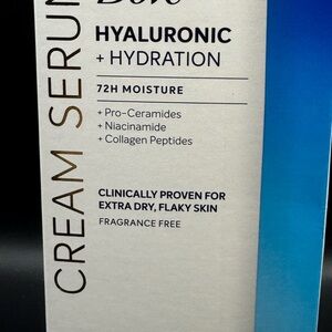Dove cream serum with hyaluronic hydration. Features a sleek design with blue and white packaging.