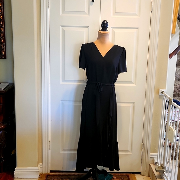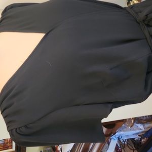 This gorgeous dress has such a nice fall/swing to it. it is structure to fit like a glove, with just a little spandex in it for a flattering fit. The back is a little longer than the front for a classy look. Easy care, beautiful feel of crepe. Can be worn for almost any event from evening to wedding to funderal. The only black dress you will need!!