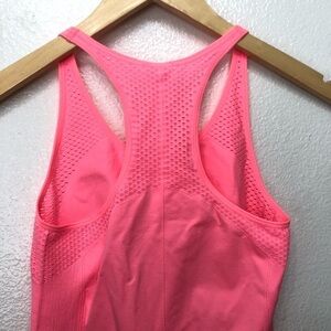 A brand new seamless workout tank top. A very vibrant pink color. Breathable, super stretchy material. Moisture-wicking, chafe resistant, racerback, and ribbed side panels.