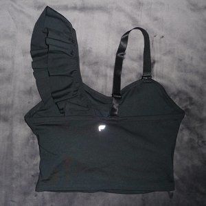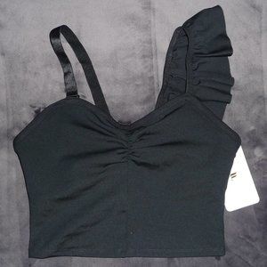 Fabletics x Madelaine Petsch Mellie Ruffle Top, black, size Medium.