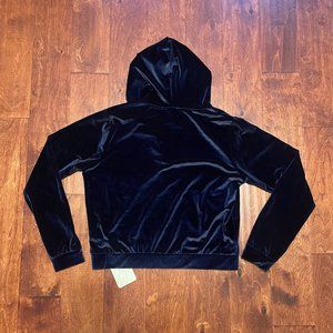 Plush velour fabric elevates this relaxed-fit hoodie with front kangaroo pocket and elastic-encased hem band.