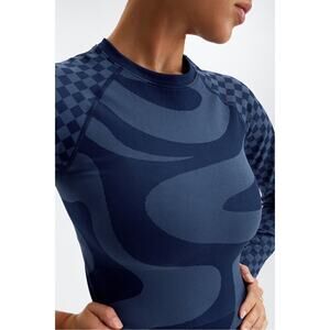 This second-skin style in our psychedelic, two-tone jacquard features a classic crew neck and super-soft fabric made partially from recycled nylon. Our second-skin seamless fabric fits like a glove. With just the right amount of compression to lift and sculpt, this breathable performance material can go from everyday errands to training sessions without a hitch.