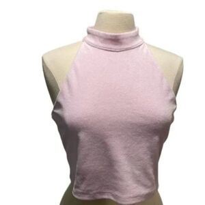 Super cute! Fitted silhouette, cropped length, thin racerback, mock neck. Pull over and snap closure on the neck. Material is cotton & polyester