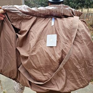 This beautiful puffer with an internal carrying strap (see last picture) and front hand pockets is your winter-time must-have jacket. Super warm and unique. It's new with tag. Pit to pit 22". Length 19". Sleeve length 21".