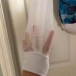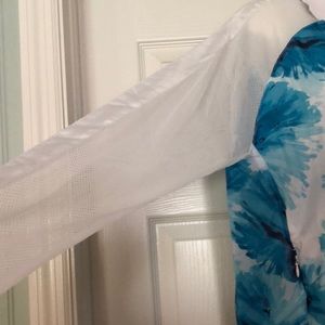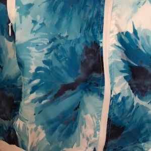 NWT Fabletics blue flowery design with mesh sleeves. Sleeves has strip design down the sleeves. Has zipper front and 2 zipper pockets on the front. Great light weight jacket for spring and summer.