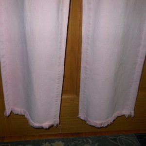 F005. A lot of stretch in these pink cropped high rise, wide leg jeans from RISEN - double-stitched seams, riveted 5 pocket styling with raw edge on hem. I could stretch another 1 1/2-2 inches on each of the measurements below (not rise/inseam). Great for summer! Acid wash pink!