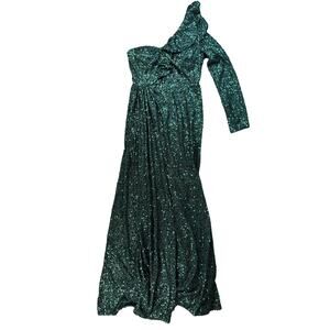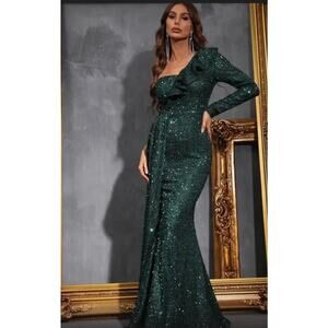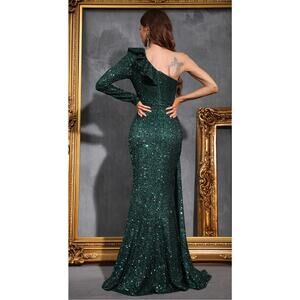 NWT Faeriesty Formal Dress Gown Sz Large Dark Green Sequin One Shoulder Mermaid