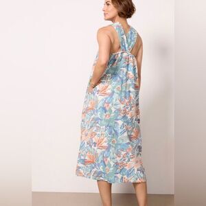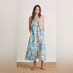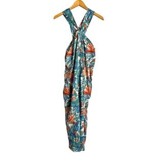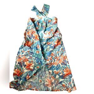 Vibrant floral print dress with a tie detail. Features a mix of blue, orange, and green colors.