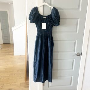 NWT Faithfull The Brand Seine Silk and Cotton Blend Midi Dress Navy Milkmaid