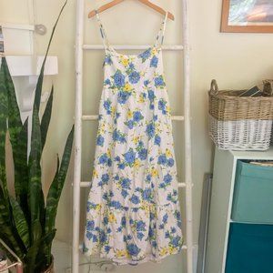 Faithful the Brand Candace Midi Dress in blue floral on white cotton. Adjustable spaghetti straps with tie back and elastic at back waist for better fit. Fully lined in white. Size L. Length measures 38” from armpit to hem; 17” from armpit to armpit across front flat (just under bust-back of bust is adjustable tie).