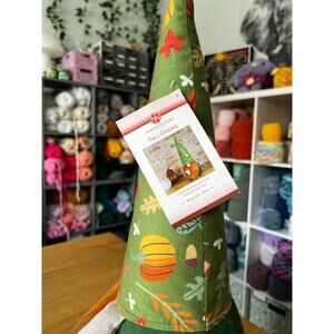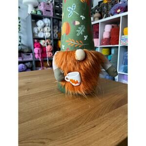 This gnome is a weighted decor piece that features a green hat with a fall pumpkin print all over. It is holding a little latte in it's hands in the front and has an orange beard. Brand new with tags attached.