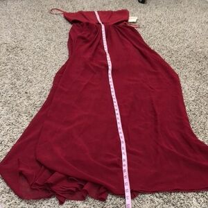 New with tags no flaws. Strapless, fit and flare silhouette dress with cut out sides. The interior slip is 27” and about mid thigh length and the exterior layer is maxi length. It has a boned bodice (not padded). Zips in back. The dress is modeled on a mannequin with 36.5” bust and 28.5” waist but was a little tight. It would better fit a 35” bust and 27” waist or smaller.