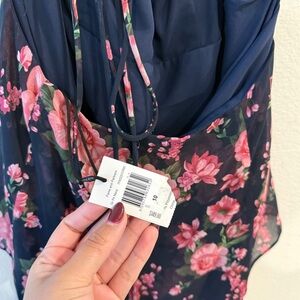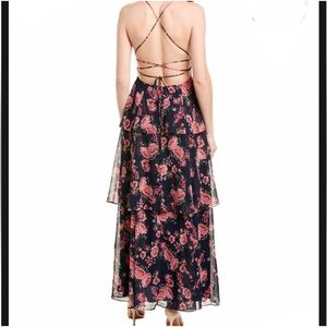 Chic navy maxi dress with pink floral print. Features layered design and delicate straps. Ideal for elegant occasions.