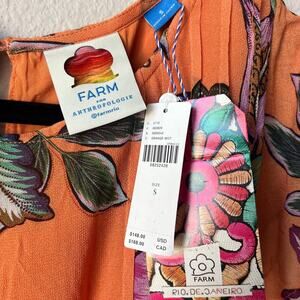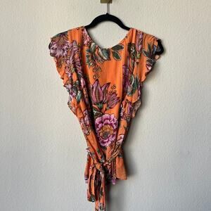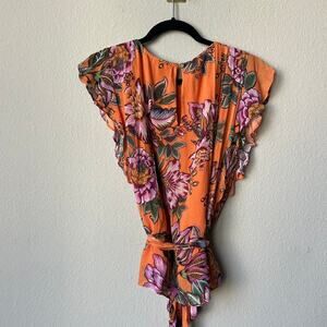NEW with tags Farm Rio Anthropologie 'Adonia' floral pintucked blouse. Flutter cap sleeves. Orange with pink florals and green foliage. Back keyhole button closure. Adjustable waist tie. Size small = 18.5" pit to pit; 23" total length.