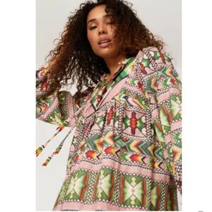 Mixed Aztec prints energize this Farm Rio dress styled with a split neck and straight, easy fit.