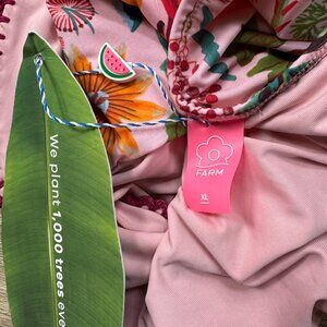 Farm Rio one-piece swimsuit in multicolor fruit print, size XL — pink with red trim and cutout details.
