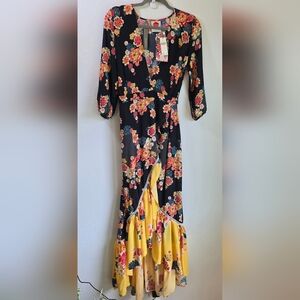 The mix pattern is exquisite with the bright floral and black floral ruffled at the bottom.