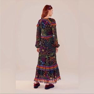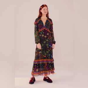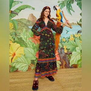 Farm Rio “Fruit Garden Maxi Dress” – stunning long dress, featuring an artistic tropical garden floral design, ruffled detailing, V-neck, long sleeves gathered at cuffs, back zipper, tiered skirt, easy and very flattering fit. Gorgeous dress!
