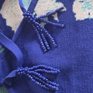 Make a bold entrance with this stunning Farm Rio Soft Garden Knit Dress! New with tags and in a size Medium, this vibrant blue dress features a tropical floral print with modern cut-outs and a unique halter neckline. The side ring detail and body-skimming silhouette make it the perfect statement piece for any summer occasion.