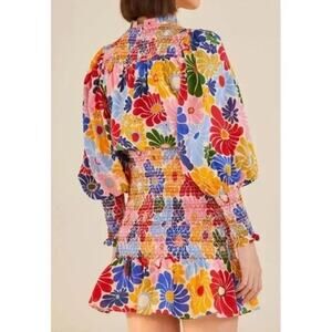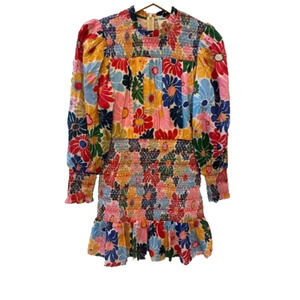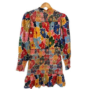 NWT Farm Rio Sunny Daisies Sand Mini Dress Floral Smocked Neck Long Sleeve M
