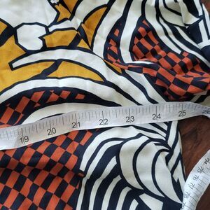 Vibrant button-up shirt with a bold pattern. Features red, black, and cream colors.