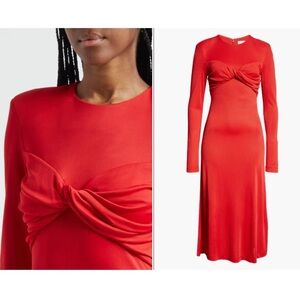 A twisted detail at the bust adds an extra touch of finesse to a long-sleeve midi dress fashioned from lightweight jersey.