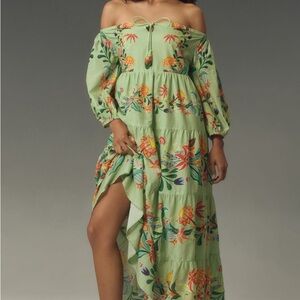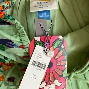 Brand new with tag attached of $238.00, Farm Rio x Anthropologie Off-the-Shoulder Tiered Floral Midi Dress in Green Motif in size XXS. This was an exclusive at Anthropologie and is an absolutely stunning dress. Keyhole tie at the neckline with beaded tassels at the end of each tie. Concealed elastic at the neckline allows the dress to be worn comfortably off the shoulders.There is a side concealed zipper with the dress made of 100% cotton and is lined with an attached slip also in cotton in a solid green to match the dress. Beautiful floral tiered dress that measures approximately 16” underarm to underarm and shoulder to hem about 46”. Please note that all measurements are taken by hand and are approximate so please know you size in this brand, thanks!