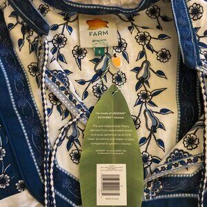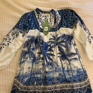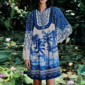 Embrace the essence of tropical beauty with the Off-White Palm Tree Beach Mini Dress. Crafted from responsible materials, this delightful piece showcases intricate palm tree patterns in serene blues and whites. The round neckline and billowy sleeves add a playful touch, while the relaxed fit ensures comfort. Perfect for sun-soaked days, this dress brings a refreshing breeze of style to your wardrobe. LENZING™ ECOVERO™: the eco-responsible fibers generate up to 50% lower emissions and water impact compared to generic viscose. FARM Rio