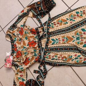 New with tag Farm Rio x Anthropologie Floral Wrap Jumpsuit. Cream, black and brightly color floral pattern. Waist has elastic in it for stretch. Size S please see measurements pictures to be sure of fit. Inseam: 28in Retail: $228