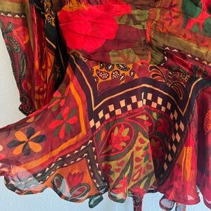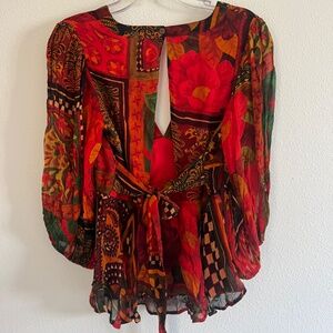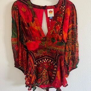 NWT Farm Rio x Anthropologie Lined Blouse Size M Red V Neck Tie Beaded Tassels
