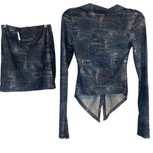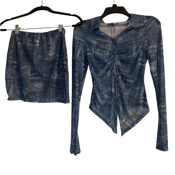 Rock this adorable Fashion Nova denim LOOK skirt and blouse set! This set is brand new with tags and features a button-front blouse with an elastic waist skirt, both in a stylish polyester fabric. This is NOT denim.