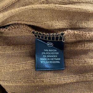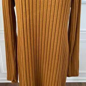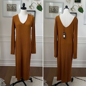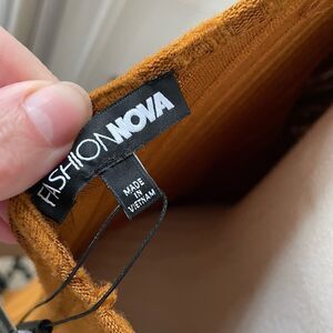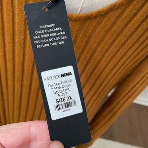 New with tags, Fashion Nova for the thrill of it deep V-neck front and back wide rib midi dress in a color that they call rust but to me looks like an orange mustard color. Lots of stretch. Ron polyester and spandex blend. Long sleeve. Size 2X and hugs your curves. Laying flat measures 48 inches shoulder to hem, 19 inches armpit to armpit and 17 inches straight across the waist