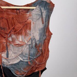 Crafted for a bold statement, this Fashion Nova bodysuit combines unique distressing with a rich rust and black color palette. The sleeveless design and comfortable fit make it a standout choice. Ideal for those seeking to express individuality with confidence.
