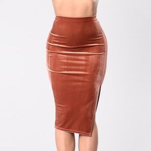 Fashion nova high waisted skirt. Chocolate pumpkin colored velvet. It's more orange rust color. Brand new with tags only tried on!!! perfect for fall season coming up